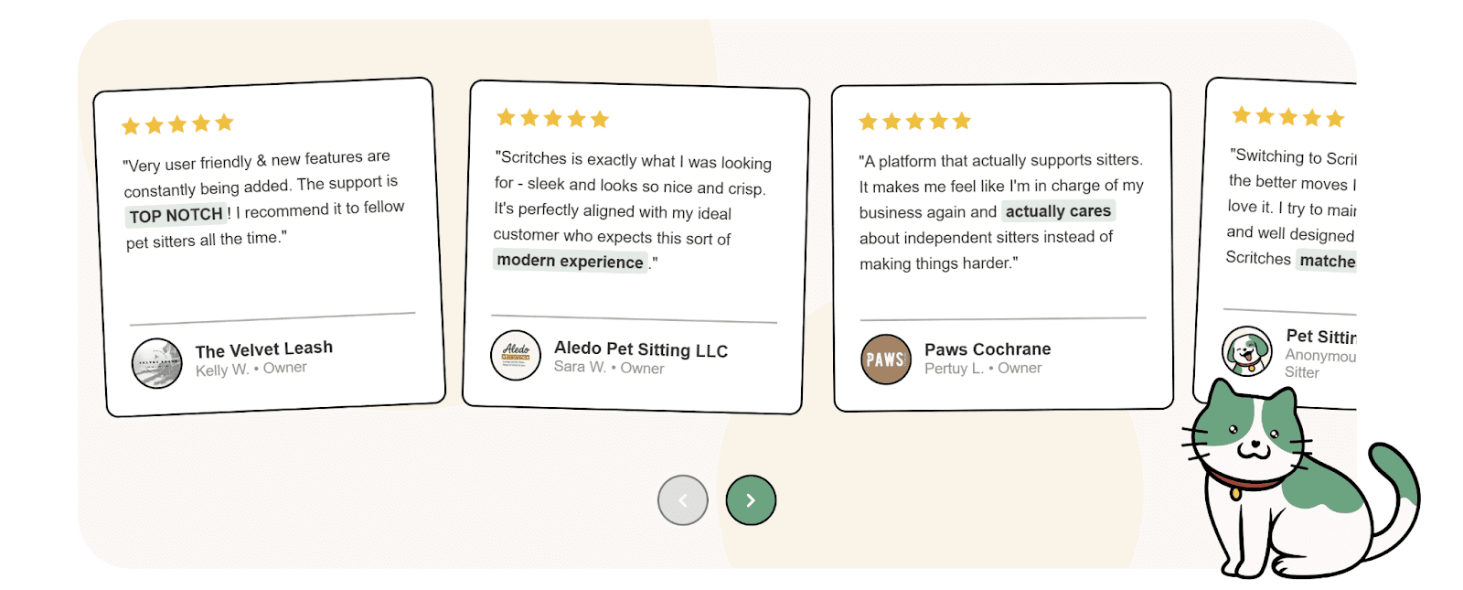 Scritches keeps your business organized, professional, and reliable. This gives you more time to focus on what’s most important: providing high-quality care to pets and building trust with your clients. See our pricing plans to see what package works best for you.