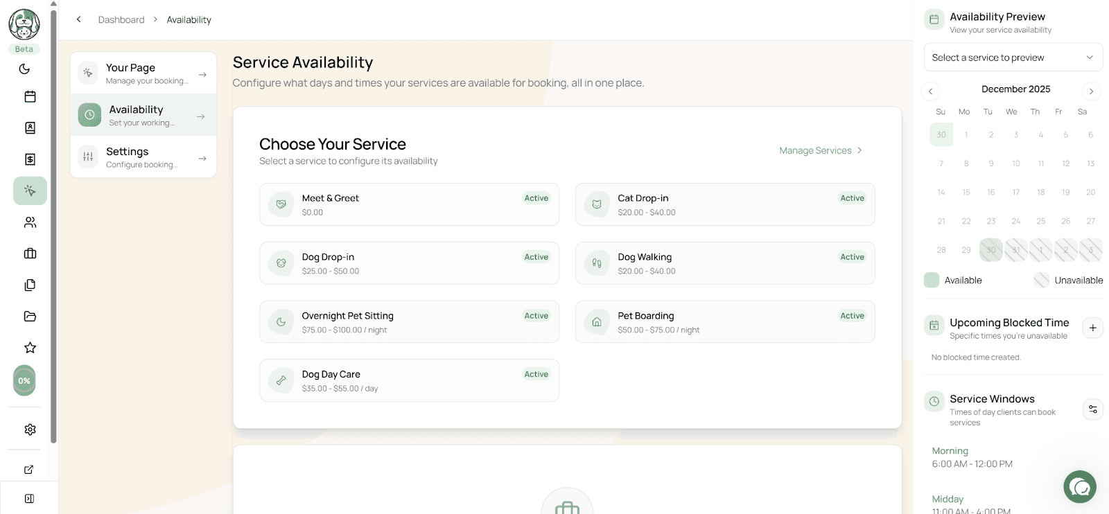 Once you’ve defined your services, the next step is determining your pricing and availability. Doing this early ensures you're making a profit while also being fair to your clients.