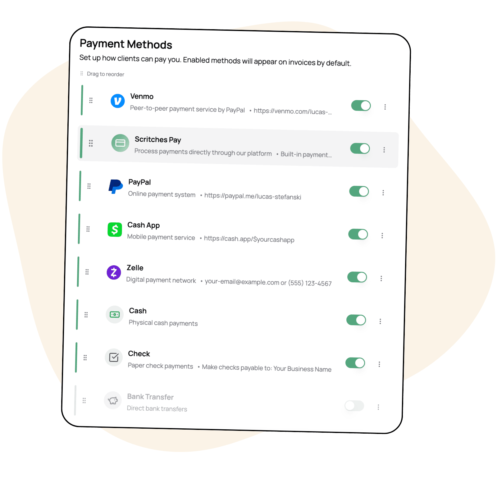 Clients can pay invoices online by credit card when Scritches Pay is enabled. You can also record payments made via cash, Venmo, Zelle, checks, or bank transfers so everything stays tracked in one place.